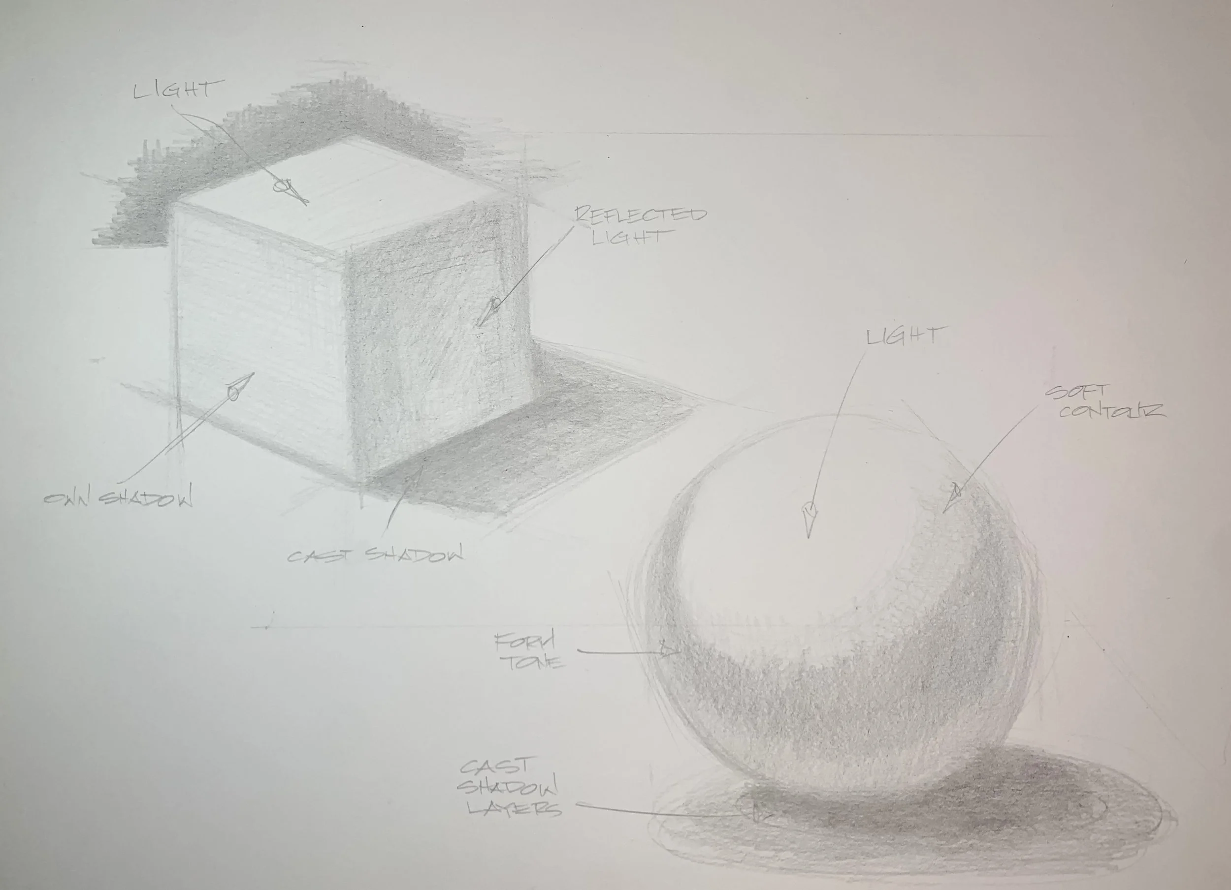 Drawing canisters, jars, cubes, spheres, and various flat surfaces to explore gradients of light and dark with cross hatching